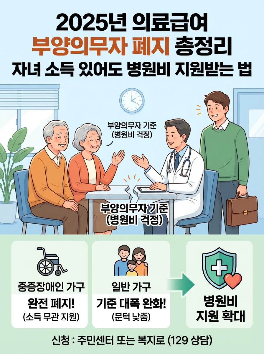 💡 핵심 요약: 이제 자녀의 소득·재산이 아주 많지 않다면, 부모님도 의료급여(병원비 면제 또는 감면) 혜택을 받을 수 있는 길이 열렸습니다.